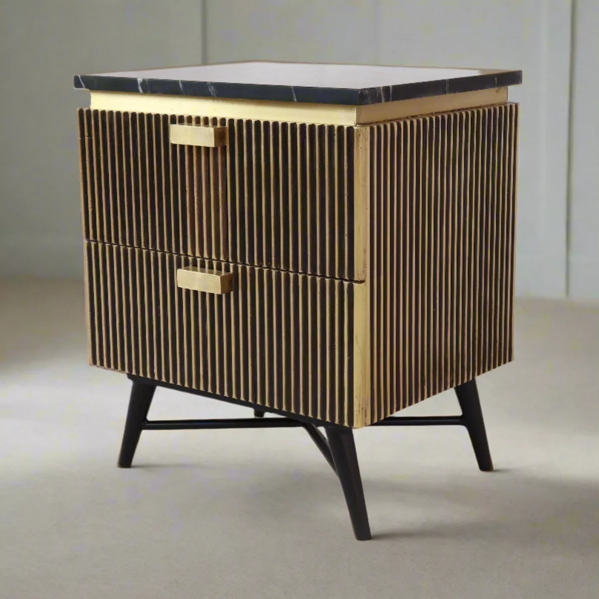 Material & Craftsmanship: Expertly crafted from premium wood with a distinctive vertical groove detailing, this marble top nightstand showcases exceptional quality in every inch. The ribbed surface is accentuated by luxurious metallic highlights in gold or brass tones, lending a refined, high-end finish. Each element is carefully assembled to ensure lasting durability and structural integrity, so you can trust this piece to maintain its beauty and functionality for years to come.