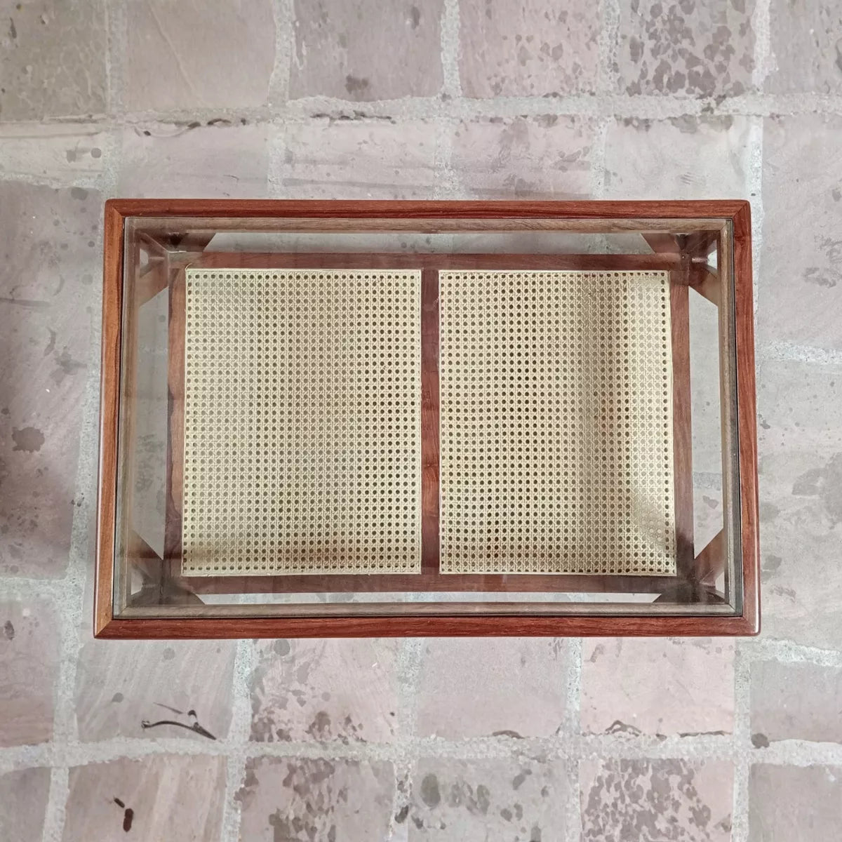 Mid-Century Design with Bohemian Soul: Inspired by iconic Danish and mid-century aesthetics, this table features sculpted edges, gracefully tapered legs, and a hand-woven cane shelf. The combination of the sleek wooden frame and the natural texture of the woven cane shelf creates a look that is both refined and down-to-earth. This glass top cane coffee table feels right at home in retro, eclectic, or contemporary interiors, providing a stylish anchor for your seating area.